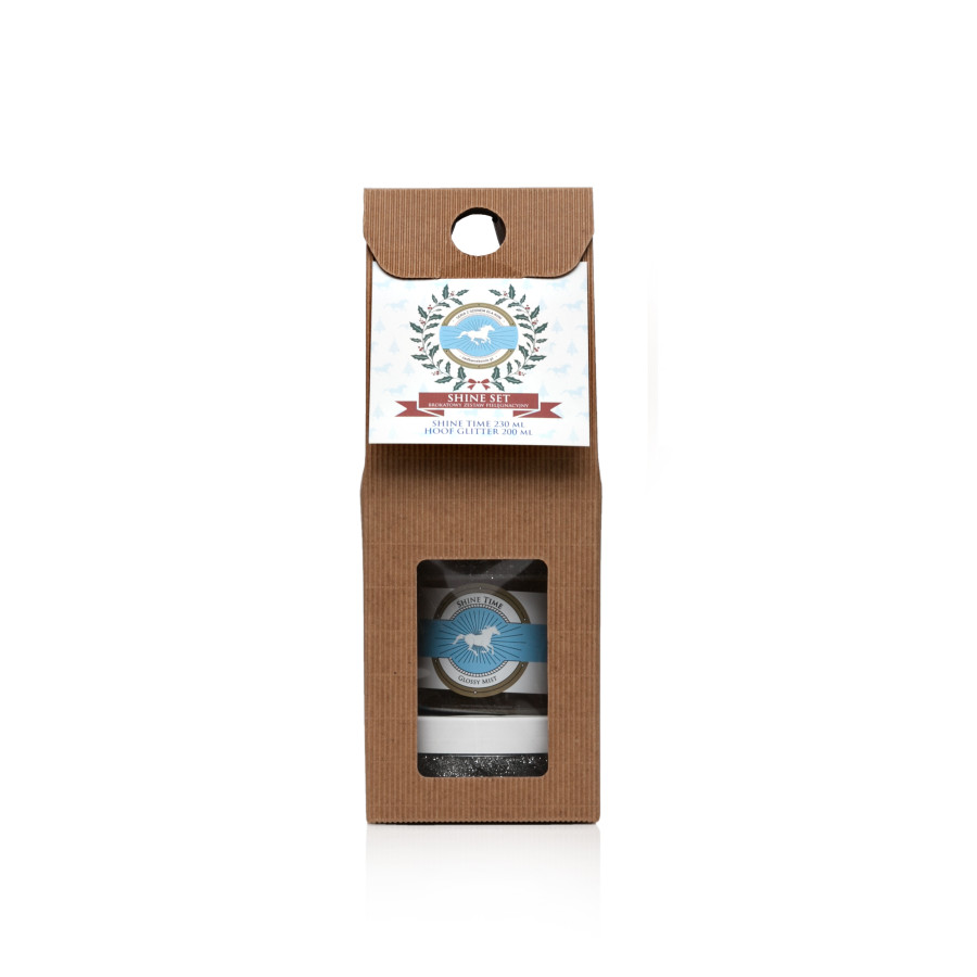 W zestawie znajdziesz brokatowy olej do kopyt i mgiełkę z brokatem. Całość opakowana w piękne, ozdobne pudełko.